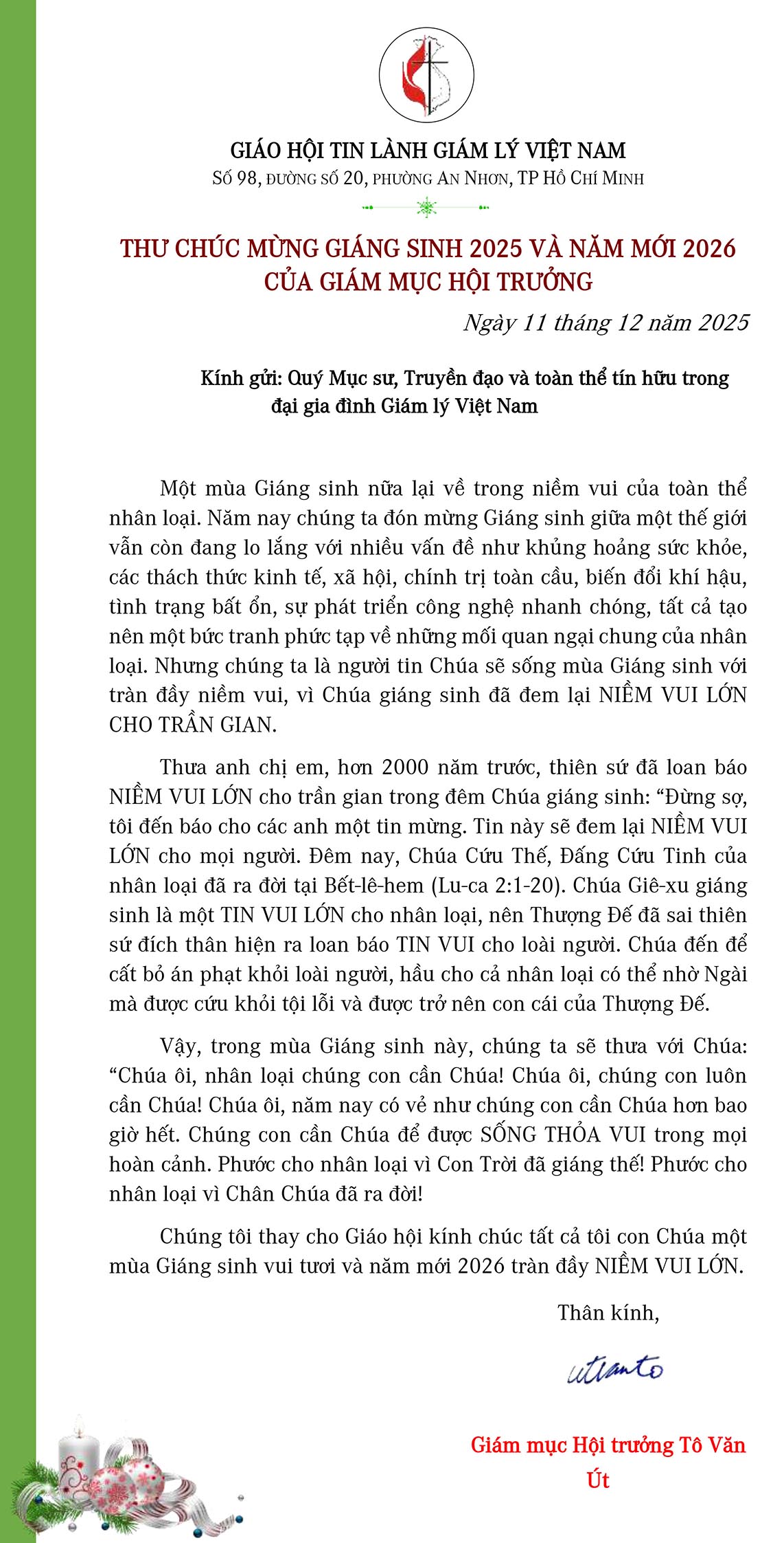 THƯ CHÚC MỪNG GIÁNG SINH 2025 VÀ NĂM MỚI 2026